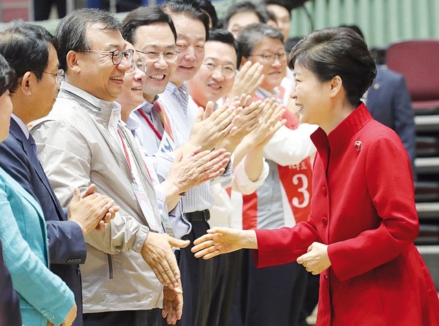 박근혜 대통령이 9일 오후 서울 잠실실내체육관에서 열린 새누리당 제4차 전당대회에 참석하며 당대표에 출마한 이정현 의원과 인사하고 있다.