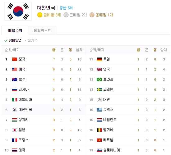다른 나라들의 순위를 보면 중국과 미국은 각각 금메달 7개와 6개를 얻어 1위와 2위를 나란히 기록하고 있다. 뒤를 이어 호주가 금메달 4개로 3위에 랭크됐다.
