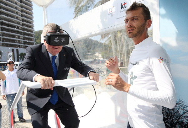[시민일보=최민혜 기자]2016 리우데자네이루 하계올림픽 기간 동안 코파카바나 해변에서 운영되는 '평창홍보관'에서 9일(한국 10일) '평창의 날' 행사가 진행됐다. 사진은 행사에 참여한 토마스 바흐 IOC 위원장(왼쪽)이 KT 부스에서 VR 스키점프를 체험하는 모습.