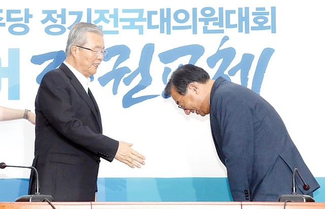 새누리당 이정현 신임 대표가 10일 오후 취임 인사차 더불어민주당 김종인 비상대책위 대표를 찾아가 허리숙여 인사하고 있다.
