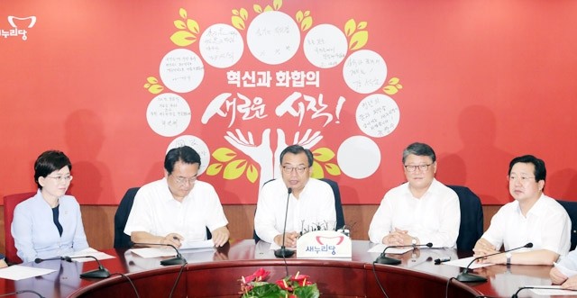 새누리당 이정현 대표가 10일 오전 서울 여의도 당사에서 열린 첫 최고위원회의를 주재하고 있다. 왼쪽부터 최연혜 최고위원, 정진석 원내대표, 이 대표, 조원진 최고위원, 이장우 최고위원.