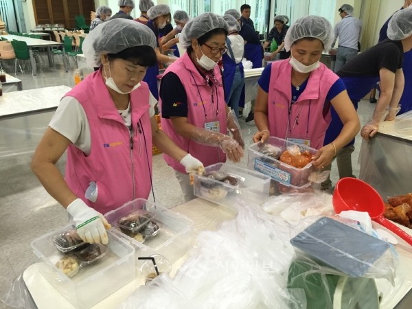 지난 10일 경북 구미시 인동동은 삼성전자 스마트시티 제2캠퍼스에서 열린 '2016 건강돌봄 찬나눔 DAY'행사에 참여했다. 사진은 인동동 마을보듬이들이 직접 만든 반찬을 포장하는 모습.(사진제공=구미시청)