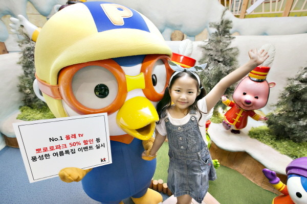 | ▲ 뽀로로파크를 방문한 어린이 모델이 올레 tv와 올레 tv 모바일에서 진행하는 뽀로로 파크 입장권 50% 할인 혜택을 소개하고 있다. | ||