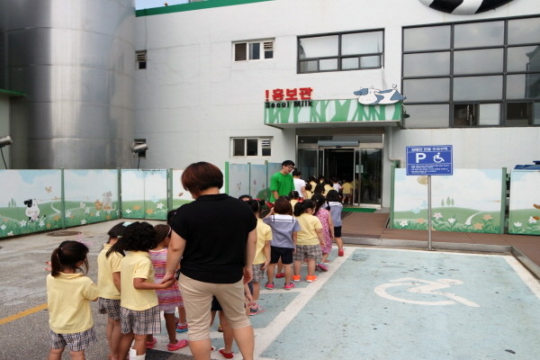 최근 경기 안산시 학교급식지원센터는 신길동 소재 서울우유 안산공장에서 로컬푸드 사용 우수 사립유치원 원아 40명을 대상으로 체험중심 식생활 교육을 실시했다. 사진은 교육에 어린이들이 줄을 서서 기다리는 모습.(사진제공=안산시청)