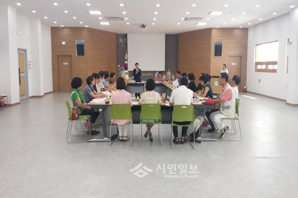 최근 경기 수원시 팔달구 매산동은 '8월중 제1차 통장 월례회의'를 개최했다. 사진은 회의에 참석한 매산동장이 통장들에게 인사말을 하는 모습.(사진제공=팔달구청)