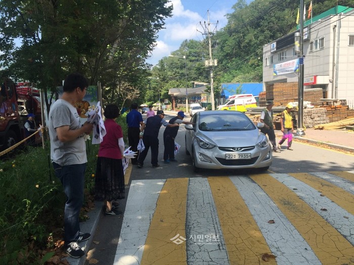 지난 11일 경기 동두천시 소요동바르게살기 위원회는 소요산 주차장 매표소 앞에서 소요산을 방문하는 차량을 대상으로 제71주년 광복절을 맞아 차량용 태극기를 배부했다.(사진제공=동두천시청)