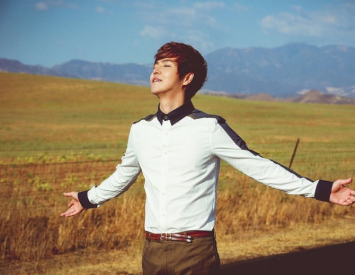 정동하는 예의 꽃미남 외모를 하고 바람이 가득한 들녘에서 두팔을 벌리고 서있다.