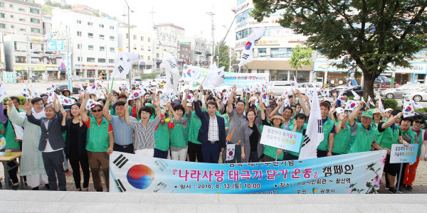 최근 제71회 광복절을 맞아 경기 광명시민회관 앞에서 열린 ‘새마을운동 광명시지회 나라사랑 태극기달기 운동’에 참석한 양기대 시장과 이병주 시의장이 시민들과 함께 태극기를 흔들며 캠페인을 펼치고 있다.(사진제공=광명시청)