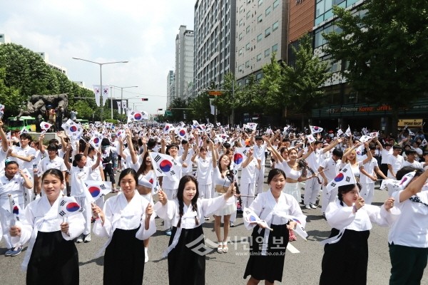 지난 15일 송파구청사거리에서 무명의 청년 독립용사들을 기리기 위해 열린 ‘광복! 그 벅찬 감동, 춤815 플래시몹’ 행사에 참가한 참가자들이 유관순 복장을 하고 태극기를 흔들며 춤을 추고 있다.(사진제공=송파구청)