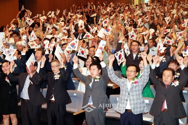 지난 15일 경기 용인시는 광복회 시지회 주최로 시청 에이스홀에서 '제71주년 광복절 경축식'을 개최했다. 사진은 정찬민 시장(앞줄 오른쪽에서 세 번째)과 이우현 국회의원(앞줄 맨 오른쪽) 등 관계자들이 만세삼창하는 모습.(사진제공=용인시청)