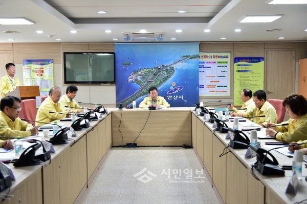 최근 경기 안산시가 시청 재난종합상황실에서 오는 22일부터 열리는 ‘2016 을지연습’을 위한 사전 준비보고회를 개최했다. 사진은 보고회에 참석한 제종길 시장(가운데)과 관계 공무원들이 토의하는 모습.(사진제공=안산시청)