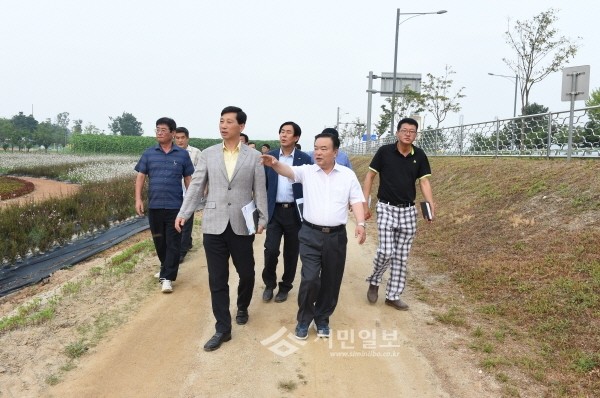 경기 양주시는 16일 광사동에 위치한 나리공원터널 앞에서 이성호 시장과 국·과장 등이 참석한 가운데 체험관광농원 조성사업 추진현황 및 향후계획에 대한 보고회를 진행했다. 사진은 이 시장(앞줄 오른쪽)이 현장을 살펴보는 모습.(사진제공=양주시청)