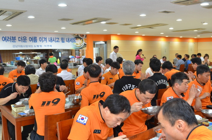 최근 강남소방서 의용소방대는 연일 이어지는 기록적인 폭염 속에 노고하는 소방대원들을 응원·격려하고자 강남소방서를 방문해 삼계탕을 제공했다. 사진은 소방대원들이 식사하는 모습.(사진제공=강남소방서)