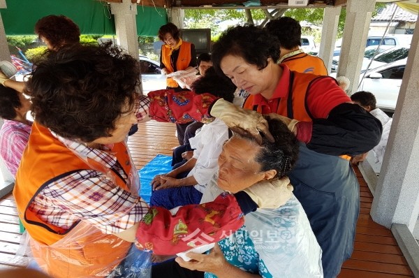 최근 전남 장흥군은 여성친화도시모니터단과 함께 용산면 인암 경로당을 방문해 노인들에게 염색·목욕·경로당 청소 등을 제공하는 '어르신 안심 공경의 날' 행사를 개최했다. 사진은 자원봉사자들이 염색 봉사활동을 하고 있는 모습.(사진제공=장흥군청)