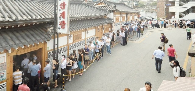 절기상 ‘말복’인 16일 서울 종로구 한 삼계탕집 앞이 점심으로 삼계탕을 먹으려는 손님들로 붐비고 있다.