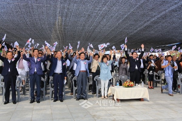 최근 전남 완도군은 항일운동기념공원에서 지역내 기관사회단체장, 주민 등 1500여명이 참여한 가운데 '제10회 소안항일문화축제'를 개최했다. 사진은 신우철 군수(앞줄 왼쪽에서 여섯번째)와 관계자들이 태극기 퍼포먼스를 하는 모습.(사진제공=완도군청)