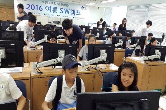 최근 서울 마포구는 여름방학을 맞아 서강대학교와 협력해 지역내 초등학교 5,6학년 40명을 대상으로 '여름방학 소프트웨어 캠프'를 개최했다. 사진은 캠프 참가 학생들이 소프트웨어 교육을 받고 있는 모습.(사진제공=마포구청)