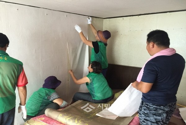 최근 경기 양평군 지평면새마을협의회는 30여명의 회원이 참여한 가운데 일신리에 홀로 거주하는 저소득 노인댁을 방문해 주거 환경정비와 함께 도배봉사를 실시했다. 사진은 봉사자들이 벽지를 새로 바르고 있는 모습.(사진제공=양평군청)