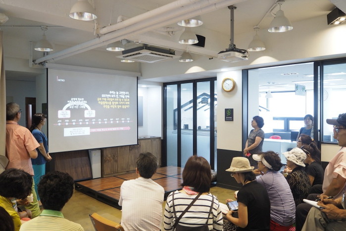 최근 성동구 금호1가동 주민센터에 도봉구 방학1동 민관참여단이 주민 주도의 자율 공간인 '마을활력소'를 벤치마킹하기 위해 방문했다. 사진은 금호1가동 마을사업전문가가 마을활력소에 대해 소개하고 있는 모습.(사진제공=성동구청)