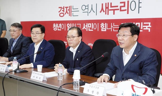 주형환 산업통상자원부 장관(오른쪽)이 18일 오후 국회에서 열린 전기요금 관련 당정 TF 1차 회의에서 인사말을 하고 있다. 주 장관은 이 자리에서 “국민들이 누진제로 인한 전기료 부담 걱정에 힘든 여름을 보내고 있어 주무장관으로서 대단히 송구하다”고 사과의 뜻을 전했다.