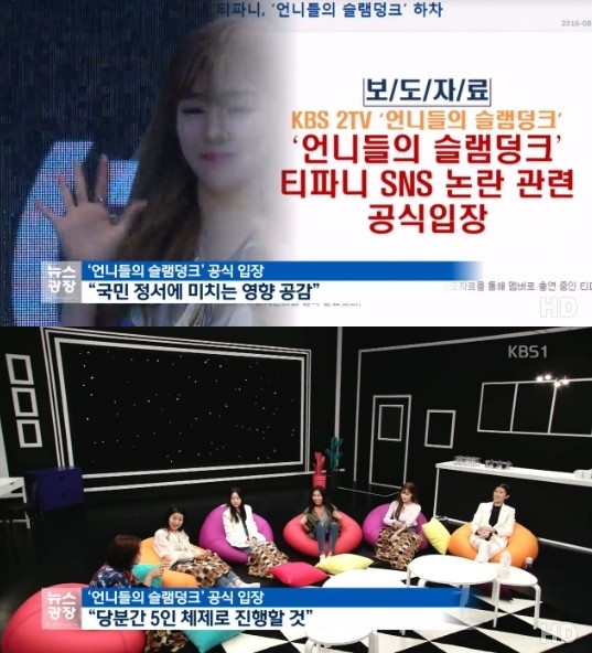 18일 '언니들의 슬램덩크' 측은 티파니 하차를 공식화했다. "논란이 된 내용이 국민 정서에 미치는 영향에 대해 공감해 멤버 티파니의 하차를 최종 결정했다"라는 이유였다.