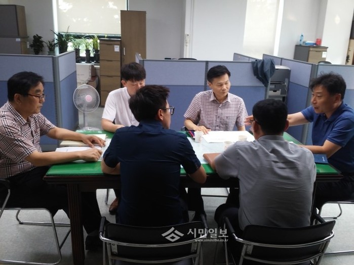 최근 서울 강동구의회 건설재정위원회 소속 박찬호 위원장과 김종범 부위원장이 의회사무국 직원들과 함께‘상임위원회 활성화 및 위원 의정활동 강화 방안’을 논의했다. 사진은 박 위원장과 김 부의원장이 직원들과 논의하고 있는 모습.(사진제공=강동구의회)