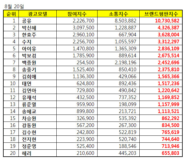 8월 광고모델 브랜드 평판 순위는 공유, 박신혜, 한효주, 수지, 아이유, 박보검, 백종원, 송중기, 김희애, 태연, 김연아, 유재석, 류준열, 송혜교, 차승원, 강동원, 김수현, 전지현, 정준영, 혜리 순이었다.