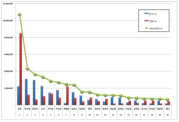 한국기업평판연구소(소장 구창환)는 2016년 7월 19일부터 2016년 8월 20일까지의 광고모델 20명의 브랜드 빅데이터 44,658,814개를 분석해 소비자들의 브랜드 참여와 소통량을 측정했다. 지난 7월 브랜드 빅데이터 45,130,234와 비교해보면 1.04% 줄어들었다.