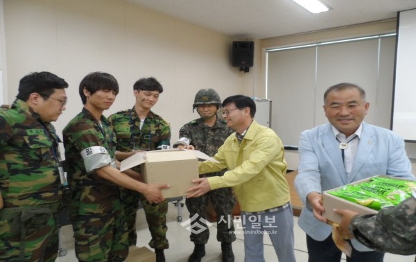 지난 22일 충남 아산시 온양3동 방위협의회 관계자들은 2016 후반기 향방작계훈련에 참여하는 예비군 305여명에게 빵, 생수, 아이스크림 등 격려의 간식을 전달했다.(사진제공=아산시청)
