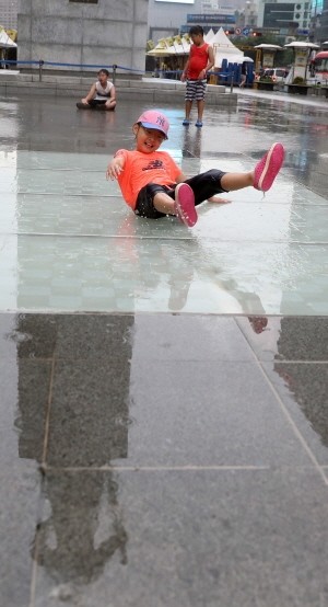 연일 계속되던 찜통더위를 식혀줄 단비가 내린 23일 오후 광화문광장 분수대를 찾은 어린이들이 비를 맞으며 놀고 있다.