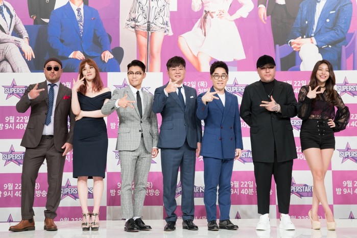 23일 오전 서울 영등포 타임스퀘어 아모리스홀에서 열린 M.net 예능프로그램'슈퍼스타K2016'(연출 이성규 이현희 이강청 황나혜) 제작발표회에 심사위원 거미, 길, 김범수, 김연우, 용감한 형제, 에일리, 한성호 대표와 엠넷 김기웅 국장, 이성규 PD가 참석했다.