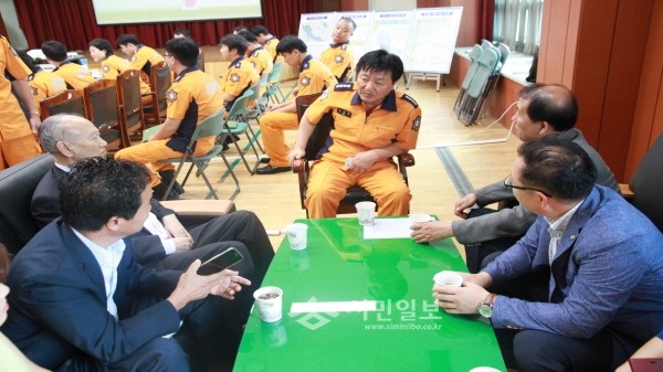 민주평화통일자문회의 마포구협의회는 을지훈련 첫날인 지난 22일 마포소방서를 방문했다. 사진은 이재옥 서장이 민주평화통일자문회의 협의회 관계자들과 이야기를 나누는 모습.(사진제공=마포소방서)