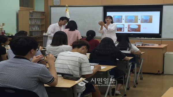 지난 22일 전남 장흥고등학교는 학교 특별실에서 목포대학교 WISET 전남지역사업단에서 수행하는 '찾아가는 실험실' 4차시 생물실험수업을 진행했다. 사진은 하지윤 교수가 학생들에게 물방울 현미경 실험 수업을 하는 모습.(사진제공=전남도교육청)