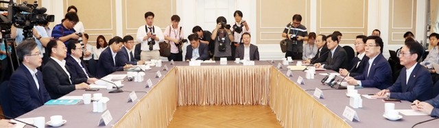 새누리당 김광림 정책위의장(오른쪽 두 번째)이 24일 오전 국회 귀빈식당에서 열린 2017년도 예산안 최종 당정협의에서 인사말을 하고 있다.