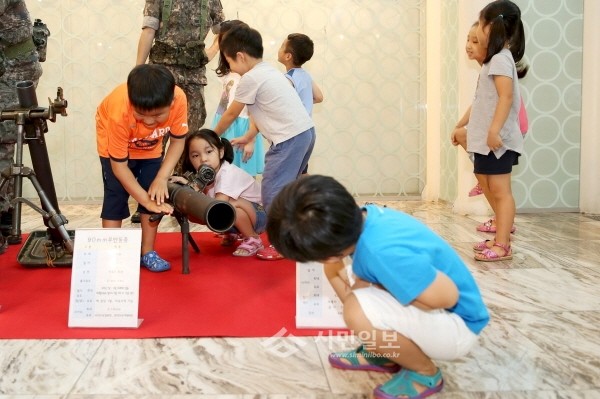 지난 24일 서울 성동구는 을지연습의 일환으로 구청 1층 비전갤러리에서 군장비 전시회 및 주먹밥 시식회를 열어 주민들의 다양한 참여를 유도했다. 사진은 군장비 전시회를 찾은 어린이들이 총 등을 신기하게 바라보고 있는 모습.(사진제공=성동구청)