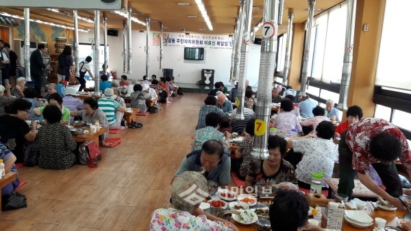 지난 24일 경기 용인시 기흥구 상갈동 주민자치위원회는 지역내 홀몸노인 150여명을 초청해 보양식을 대접하는 '복달임' 행사를 개최했다. 사진은 노인들이 식사를 하고 있는 모습.(사진제공=용인시청)