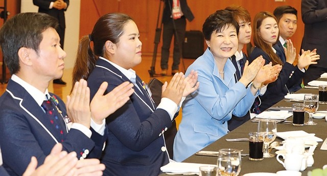 박근혜 대통령이 25일 청와대에서 열린 리우 올핌픽 선수단 오찬에서 선수단을 소개할 때 박인비 선수 등 참석자들과 함께 박수치고 있다.
