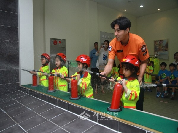 26일 서울 은평소방서는 시민안전체험관을 방문한 진관 어린이집 원생 및 지도교사 40여 명에 대해 안전체험 교육을 실시했다. 사진은 어린이들이 소화기 사용 실습을 하는 모습.(사진제공=은평소방서)