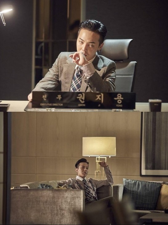 지드래곤은 '전무 권지용'이라고 써져 있는 명패를 앞에 두고 거만한 자세로 임원방에 앉아 매서운 눈빛으로 남다른 '포스'를 뽐냈다.