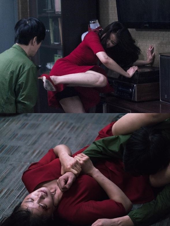 사진 속 이시영은 빨간색의 원피스와 높은 킬힐을 신었음에도 불구, 배우 김원해에게 강력한 발차기를 날리고 있다.