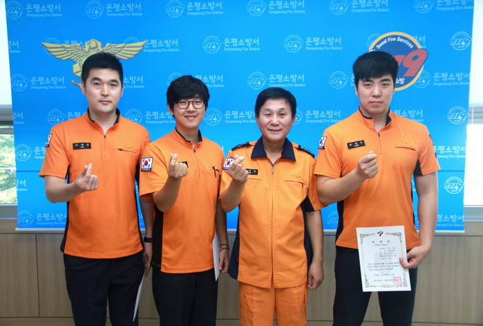 29일 은평소방서는 신속·정확한 현장 응급처치와 병원이송으로 심정지 환자를 소생시킨 구급대 박형우ㆍ유승현ㆍ이재은 소방사에게 하트세이버 증서를 수여했다. 사진은 심재강 서장과 소방사들이 기념촬영을 하는 모습.(사진제공=은평소방서)