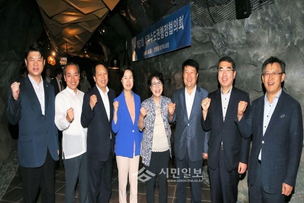 최근 경기 광명동굴에서 서부수도권행정협의회가 열린 가운데 양기대 광명시장(오른쪽 두 번째)과 협의회에 참여한 지방자치단체장들이 모여 파이팅을 외치고 있다.(사진제공=광명시청)