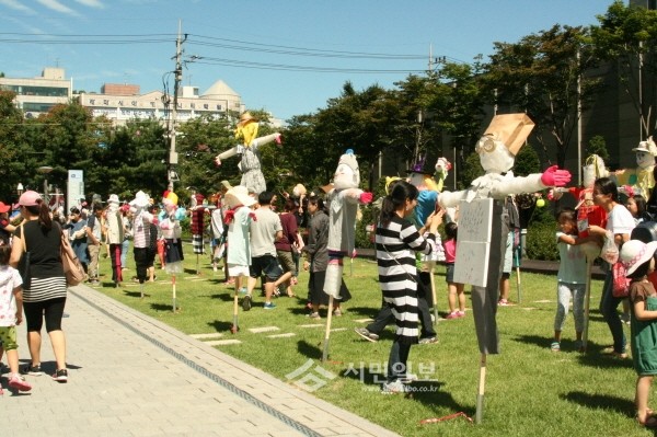 최근 경기 용인시 수지구는 구청광장에서 주민 80여가족이 참여한 가운데 옛 농촌의 정취가 물씬 풍기는 '허수아비 만들기' 행사를 개최했다. 사진은 주민들이 구청 광장에 전시된 허수아비들을 살펴보는 모습.(사진제공=용인시청)