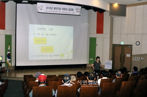 지난 29일 서울 노원구는 구청 소강당에서 노인 성교육 전문강사인 김용숙씨를 초청해 '찾아가는 어르신 성교육'을 실시했다. 사진은 교육에 참가한 노인들이 강의를 듣고 있는 모습.(사진제공=노원구청)