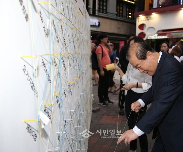 지난 30일 박홍섭 서울 마포구청장은 상수동 홍익대학교에서 열린 '제24회 홍대앞 거리미술전'에 참석했다. 사진은 박 구청장이 홍대앞의 먹거리, 문화생활 등을 나타내는 핵심어들을 실로 연결하는 '홍대앞에 가면 _가 있다'를 해보는 모습.(사진제공=마포구청)