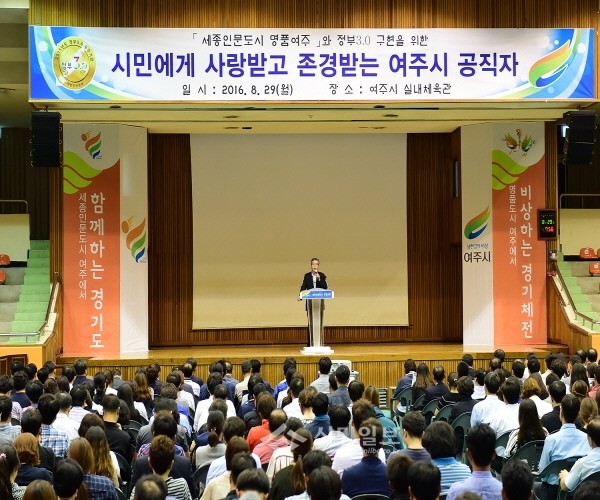 지난 29일 경기 여주시는 여주실내체육관에서 시청에 근무하는 공무원은 물론 모든 직원 1100여명이 참석한 가운데 '시민에게 사랑받고 존경받는 여주시 공직자'라는 주제로 전 직원 교육을 실시했다. 사진은 원경희 시장이 강연을 진행하는 모습.(사진제공=여주시청)
