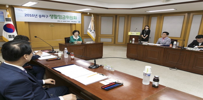 지난 30일 송파구 기획상황실에서 열린 ‘2017년 생활임금위원회’에 참석한 박춘희 구청장(가운데)가 위원회로부터 ‘송파구 생활임금제’를 소개와 추진경과를 보고받고 있다.(사진제공=송파구청)