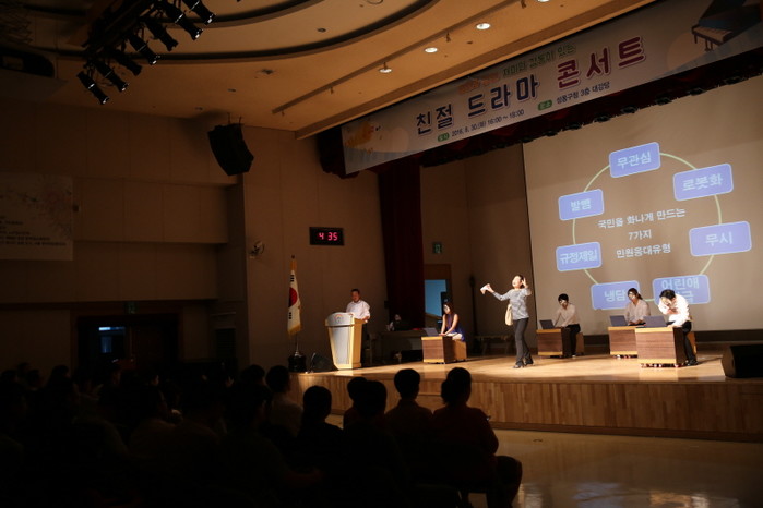 최근 성동구는 구청 대강당에서 직원 500여명이 참석한 가운데 '민원인의 마음으로 친절을 봅니다'라는 역할극을 관람하는 등 직원 친절 교육을 실시했다. 사진은 무대에서 역할극이 진행되고 있는 모습.(사진제공=성동구청)