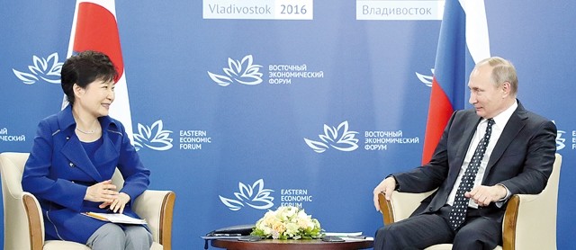 박근혜 대통령과 블라디미르 푸틴 러시아 대통령이 3일(현지시간) 러시아 블라디보스토크 극동연방대학에서 열린 정상회담에서 대화하고 있다. 이번 양자 회담은 한미 양국이 지난 7월 8일 고고도 미사일 방어체계(THAADㆍ사드) 배치를 공식 발표하고 중국과 러시아가 반대 공세를 강화하면서 북핵 문제에 대한 국제 공조가 깨지는 것 아니냐는 우려가 계속된 가운데 진행되는 것이다.