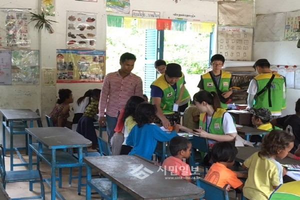 최근 경북 구미시에 위치한 금오공업고등학교는 학생들의 봉사정신 함양 및 글로벌 안목을 향상시키기 위한 목적으로 4박6일간 캄보디아 씨엠립에서 '국제 교류 활동'을 실시했다. 사진은 학생들이 캄보디아 어린이들에게 교육봉사를 하고 있는 모습.(사진제공=금오공업고등학교)